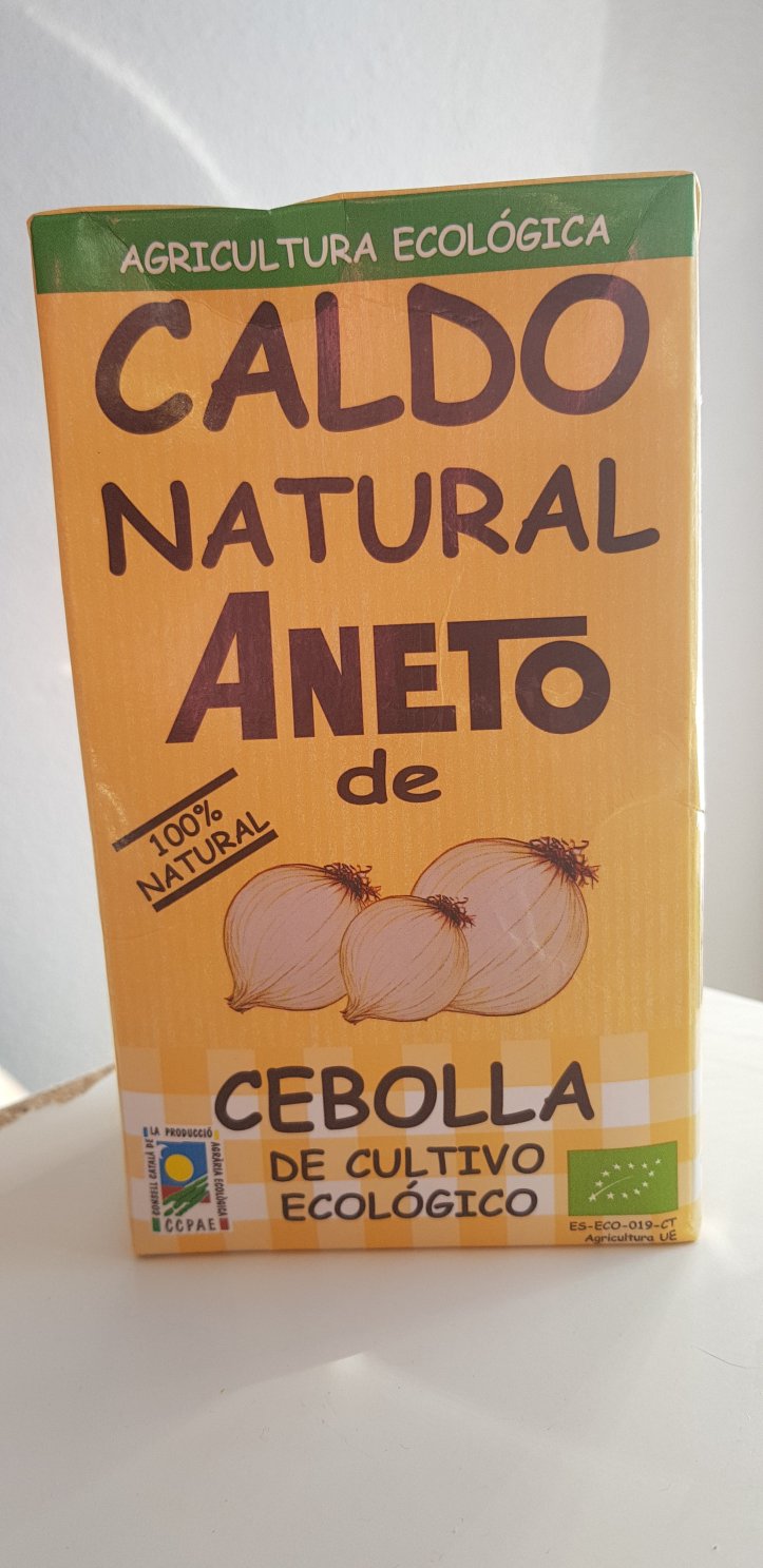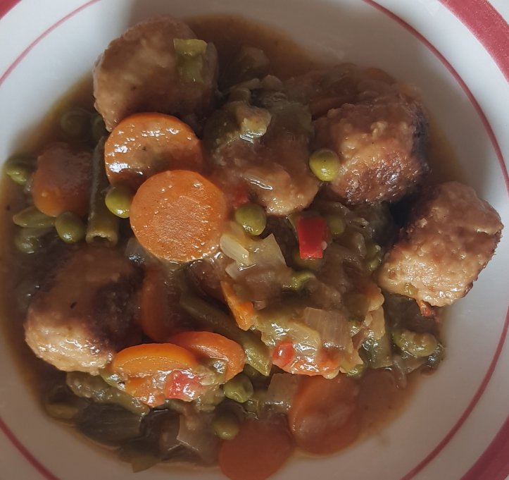 Necesitamos, albóndigas ya hechas, yo las compro en una polleria, que les pides que las hagan y te las hacen como tú quieres, pero también las venden envasadas ya hechas; cebolla cortada congelada, pimiento verde y rojo cortado congelado, calabacín cortado congelado, guisantes congelados, judías verdes redondas congeladas y zanahorias cortadas congeladas; aceite de oliva virgen extra, caldo Aneto de cebolla ecológica, y sal.